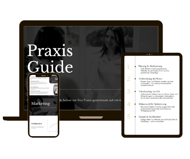 Mit unserem Praxis-Guide heben wir Ihre Praxis gemeinsam auf ein neues Level. Von professionellen Fotos über ansprechende Visitenkarten, Printmaterialien und Videos bis hin zu gezieltem Marketing – wir zeigen Ihnen praxisnahe Tipps, die Ihre Praxis sichtbar machen, Patienten begeistern und Ihren Erfolg langfristig sichern.